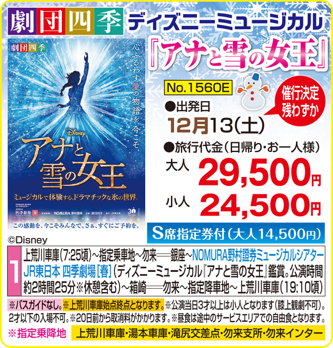 | ツアーNo | 1560ED | ツアー名称 | 劇団四季 ディズニーミュージカル『アナと雪の女王』 |