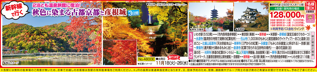 ツアーNo | 4800EA | ツアー名称 | 秋色に染まる古都京都と彦根城 3日間 |